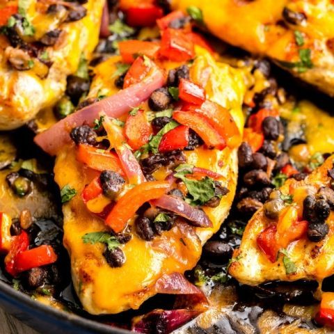 Tex-Mex at its finest: This skillet chicken is topped with melty cheddar and a delicious black bean-red onion mixture.